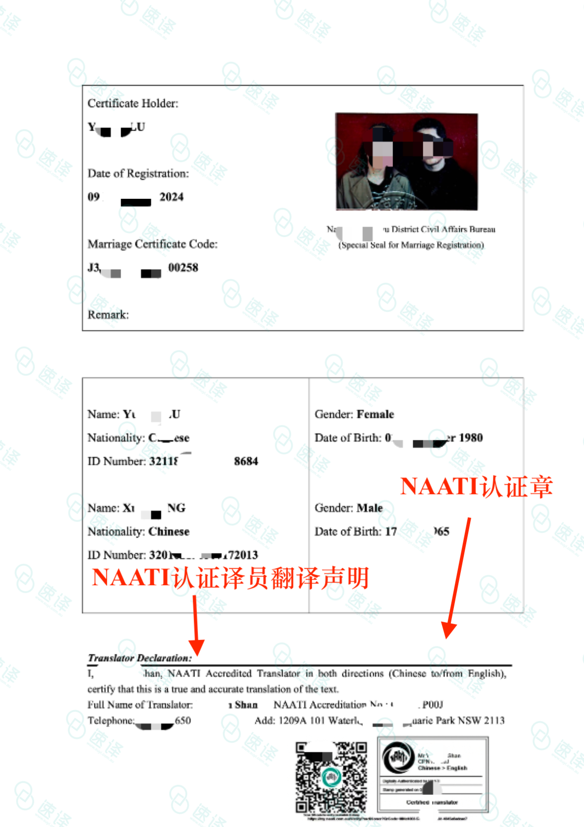 - 翻译的NAATI章 (上面有NAATI翻译的标号-naati官网可以进行验证或者直接电话naati提供编号、翻译的姓名、认证方向、认证期限)
