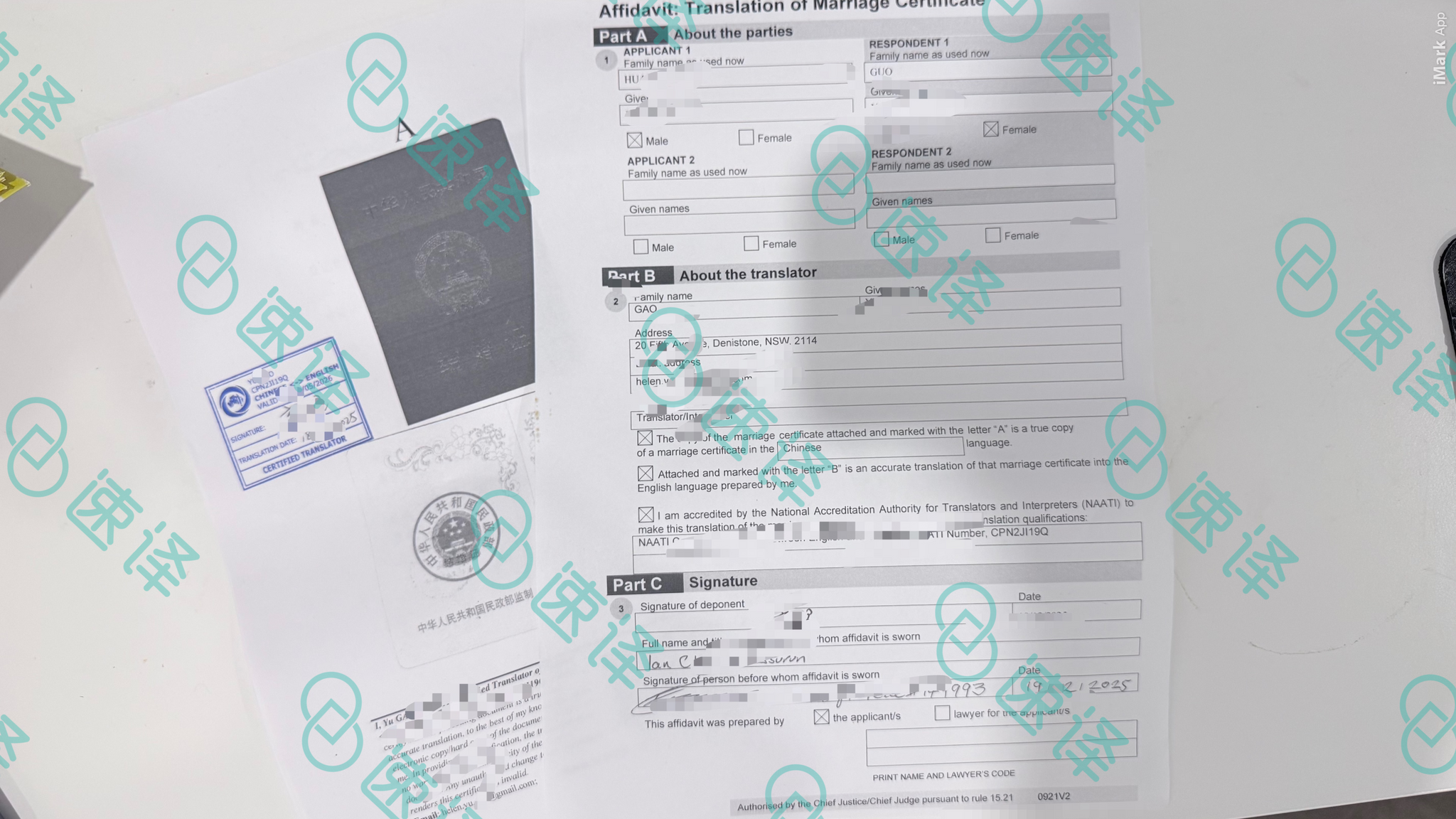 请加我们的微信:suyiaus拍照或者扫描中国结婚证,我们有多年给澳洲法庭提供翻译宣誓书的丰富经验,客户只需要提供给我们中国结婚证清晰照片,并告知我们需要翻译宣誓书,我们会按照澳洲法庭的要求直接帮您做好,不需要给我们提供翻译宣誓书。