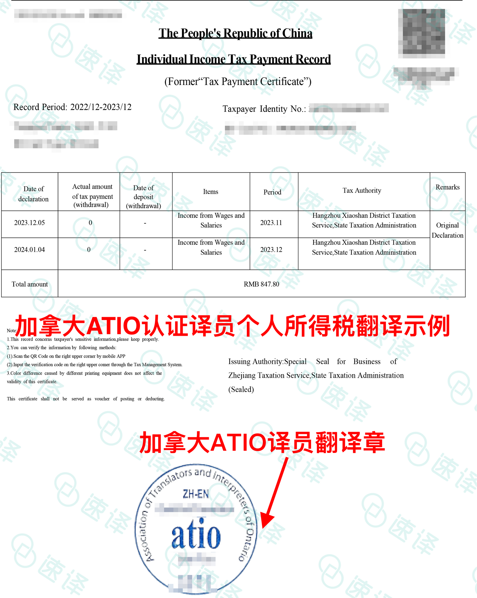 加拿大 安省ATIO 纳税所得记录翻译