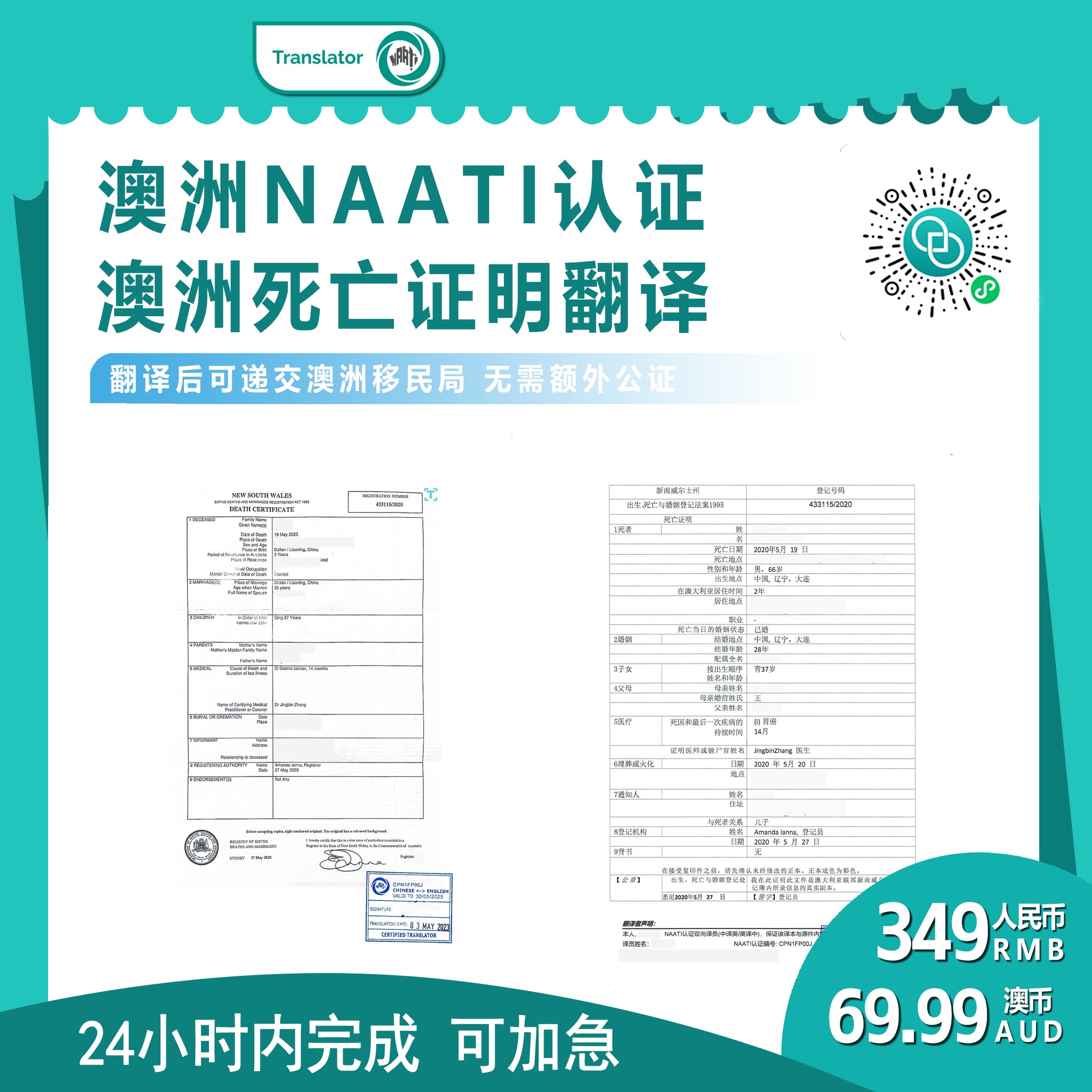 速译为您提供NAATI认证澳洲死亡证明翻译服务,翻译件经澳大利亚NAATI三级认证译员翻译盖章与声明,澳大利亚及中国大使馆均认可。