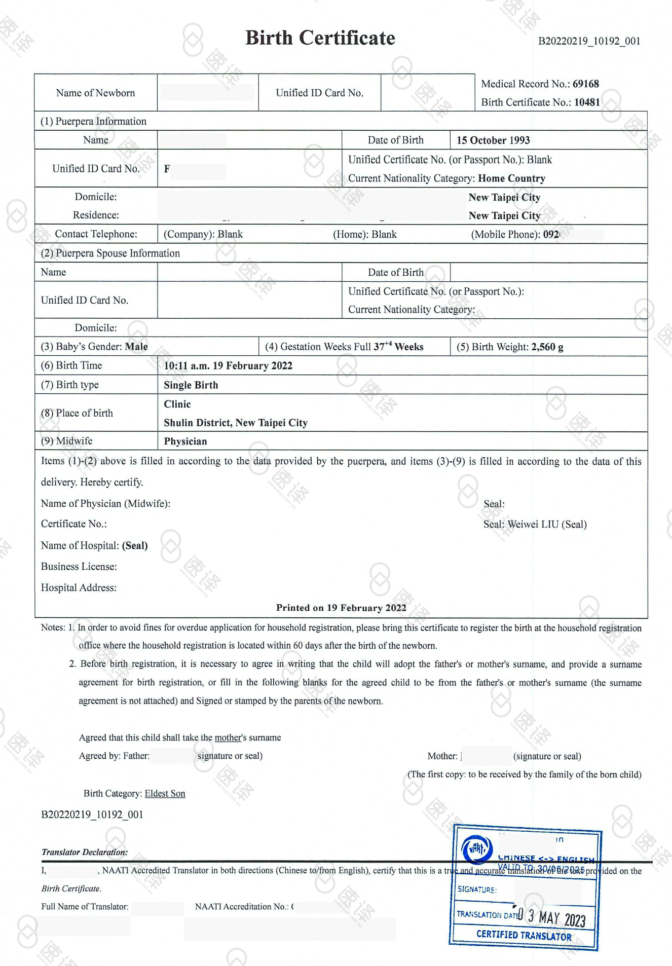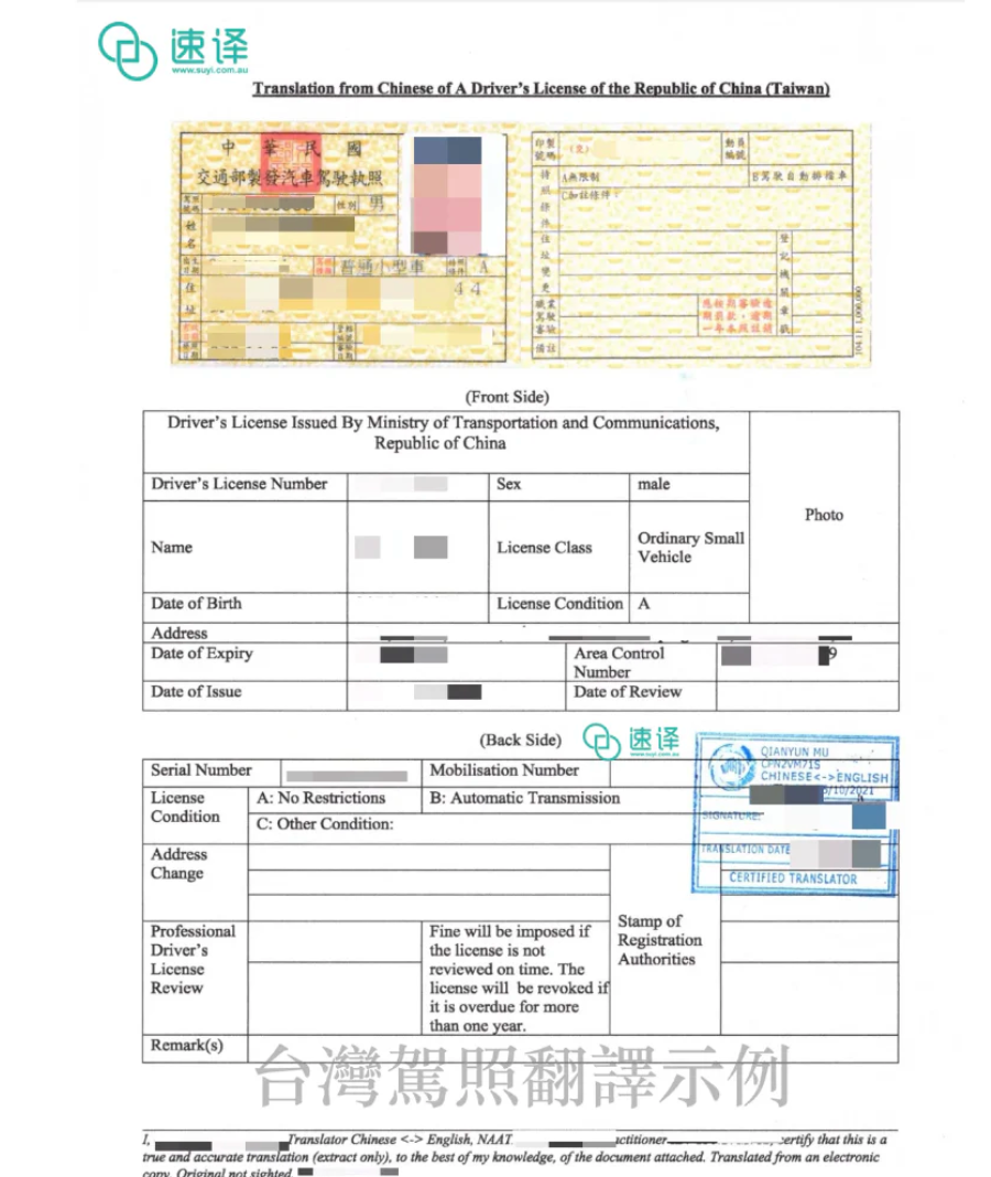 - 翻譯的NAATI章 (上面有NAATI翻譯的標號-naati官網可以進行驗證或者直接電話naati 提供編號、翻譯的姓名、認證方向、認證期限)