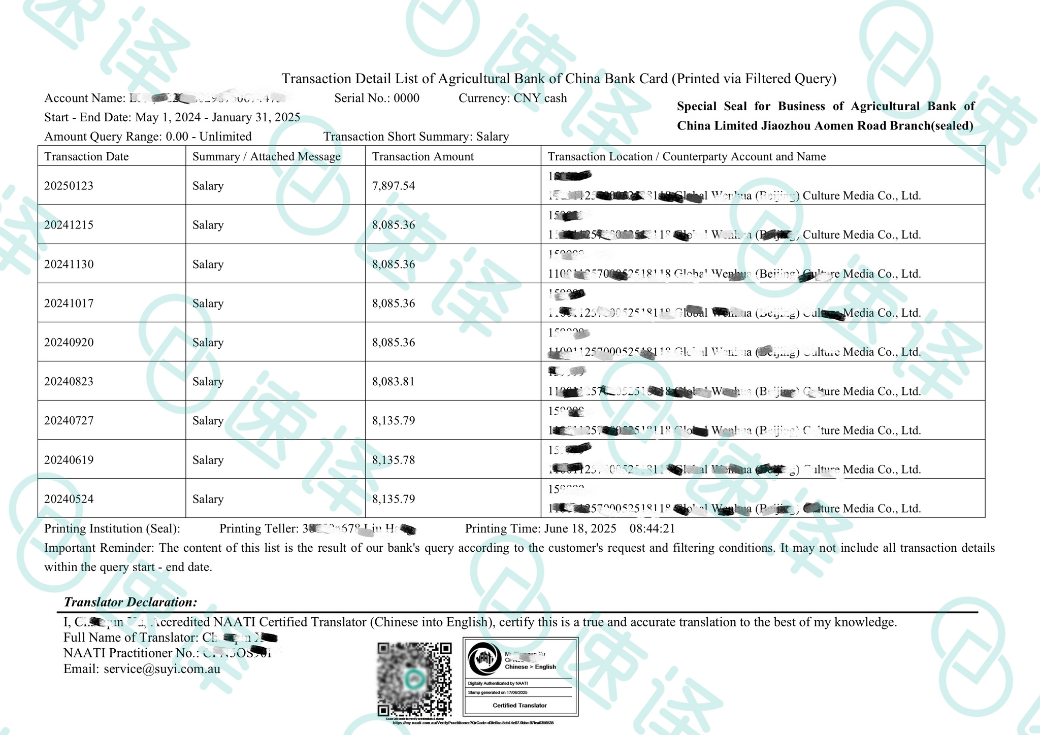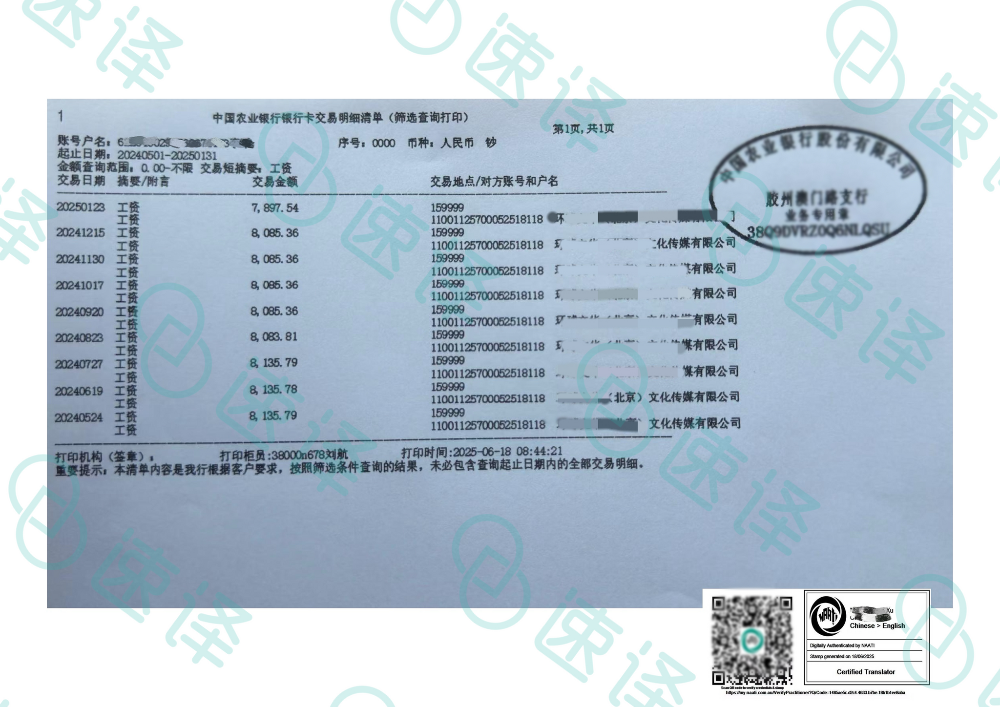在澳洲办理留学签证、移民申请、房屋贷款、学校入学等手续时,银行流水往往是必备文件。由于原件是中文或其他语言,官方部门(如移民局、银行、教育机构)要求必须提供NAATI认证翻译